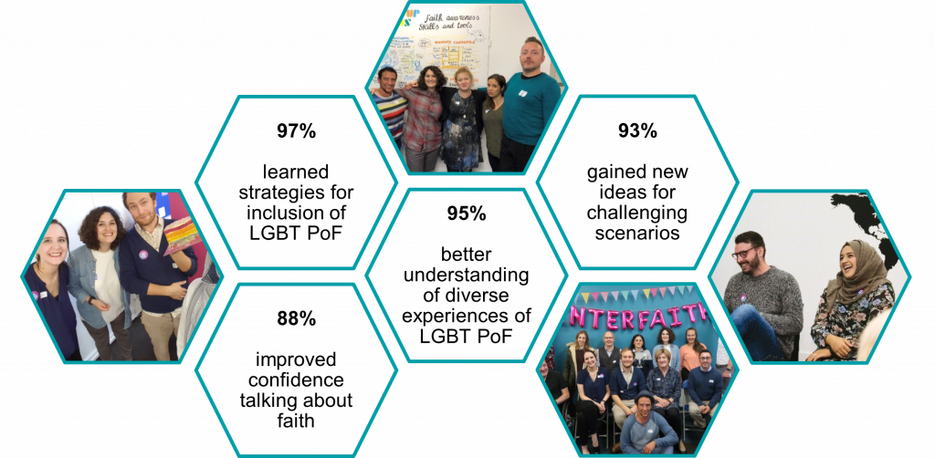 Our LGBTQ+Faith training sessions allow participants to reflect, learn, and build their practice for working with and supporting LGBTQ+ people of faith. Since 2017 we have supported over 100 organisations across the UK to offer better support to LGBTQ+ people of faith in their communities.