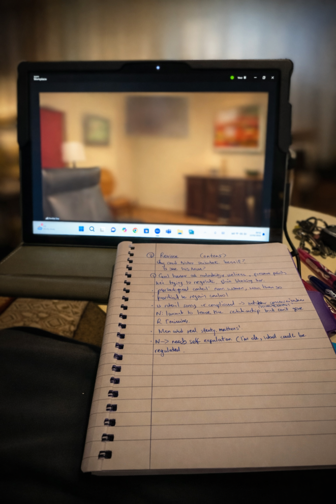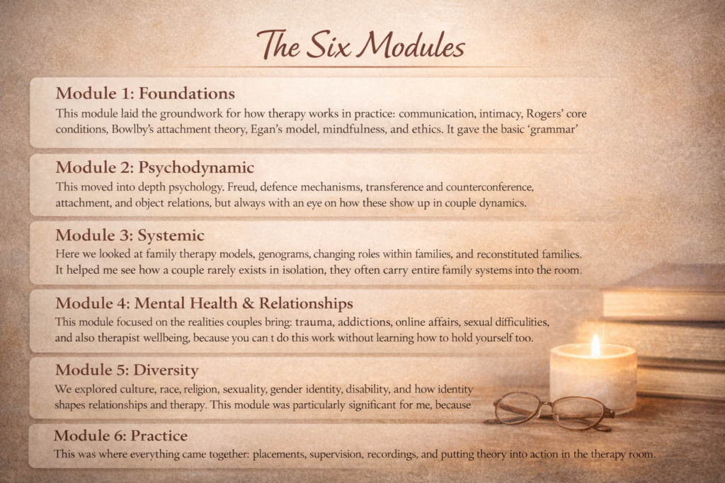 Each module included essays and reflective pieces. For the final module, I wrote a case study applying theory to practice and the use of supervision. I also presented on menopause and its impact on couples (don’t ask how I got that topic! 😂).