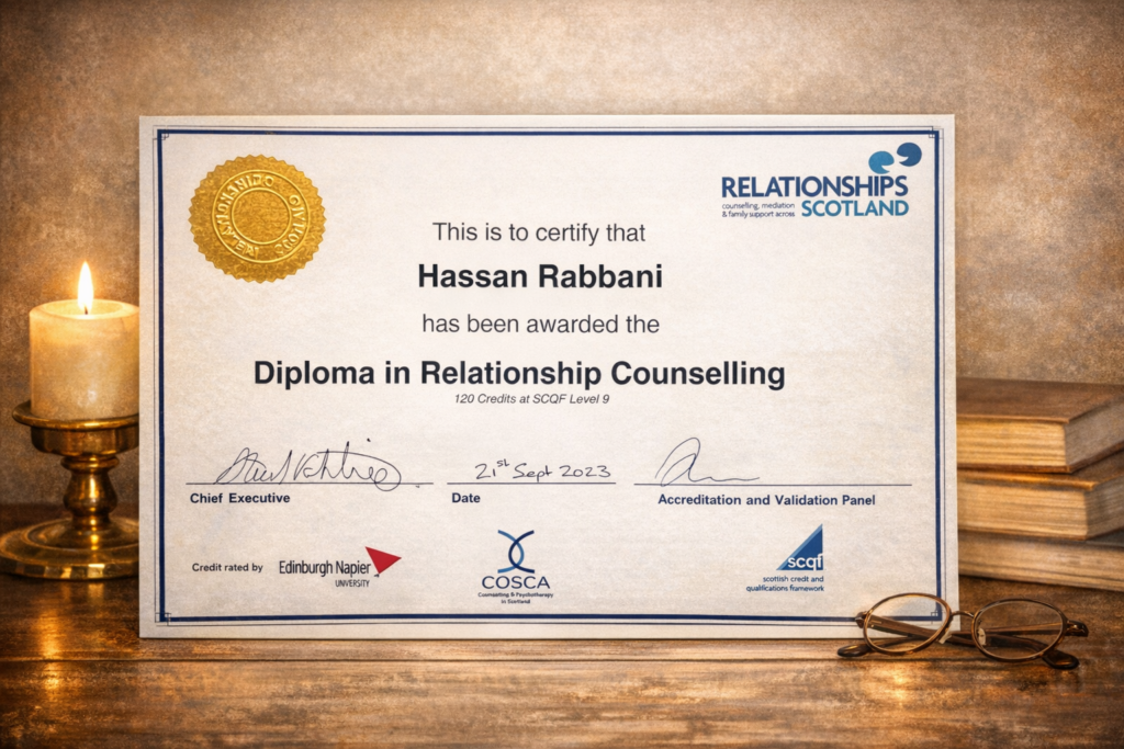 This was a two and a half year programme with Relationships Scotland, the country’s largest provider of counselling and mediation, accredited by Edinburgh Napier University. It was practical, rooted in real family life, and consistently linked theory to what actually happens in the therapy room.